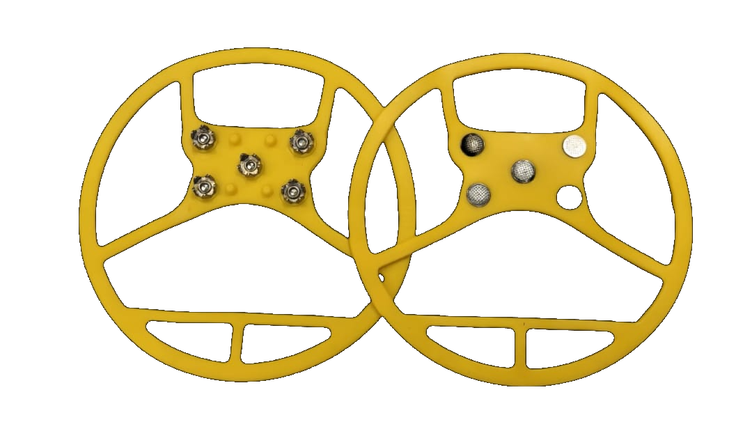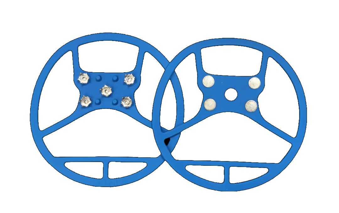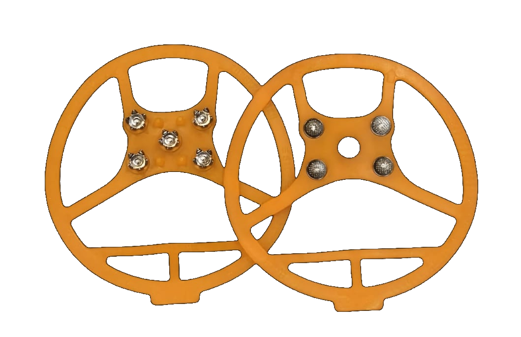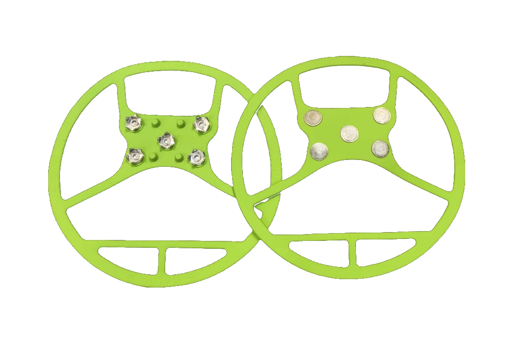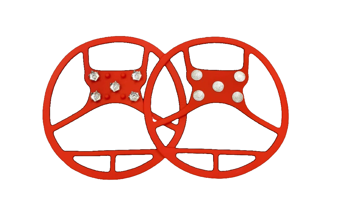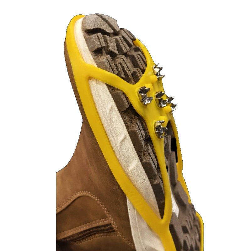 橡膠, 鐵, 不銹鋼 “採用冰地、雪地專用物料 不易在寒冷地方變得脆弱 圓形束在鞋底的設計,方便拆卸”